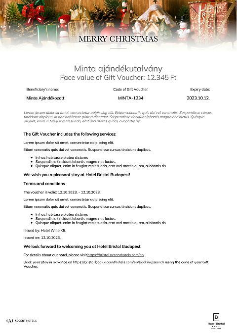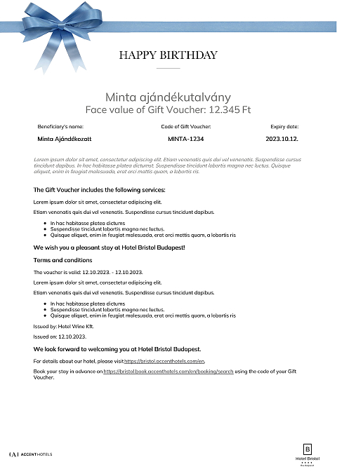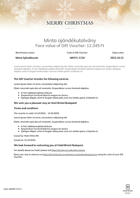 This voucher can be redeemed in Hotel Bristol Budapest for any booking and services that inculdes at least a one-night stay.